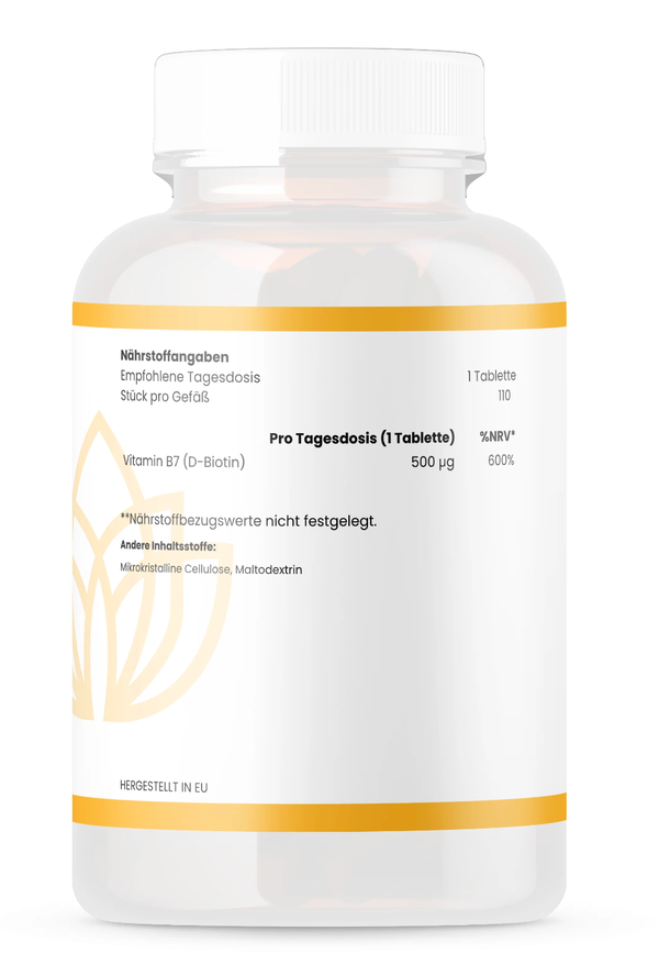 Biotin, auch bekannt als Vitamin B7, ist ein essentielles Vitamin, das eine Schlüsselrolle im Stoffwechsel von Kohlenhydraten, Fetten und Proteinen spielt. Es trägt zur Erhaltung normaler Haut, Haare und Nägel bei und unterstützt zudem die normale Funktion des Nervensystems.