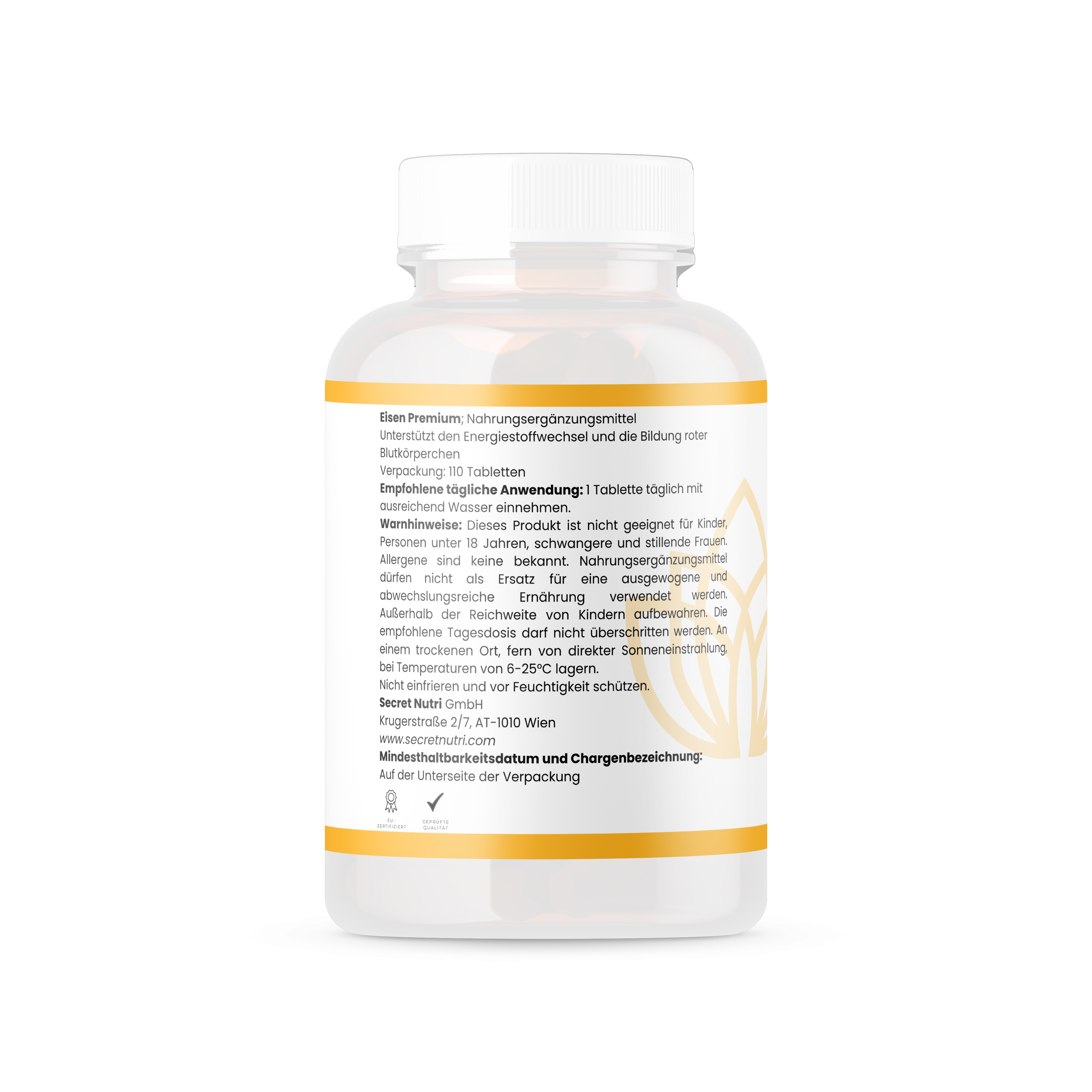 Nahrungsergänzungsmittel: Eisen – Die Mengen pro Tablette entsprechen den Angaben des Herstellers. Nahrungsergänzungsmittel sollten nicht als Ersatz für eine ausgewogene und abwechslungsreiche Ernährung und eine gesunde Lebensweise verwendet werden.