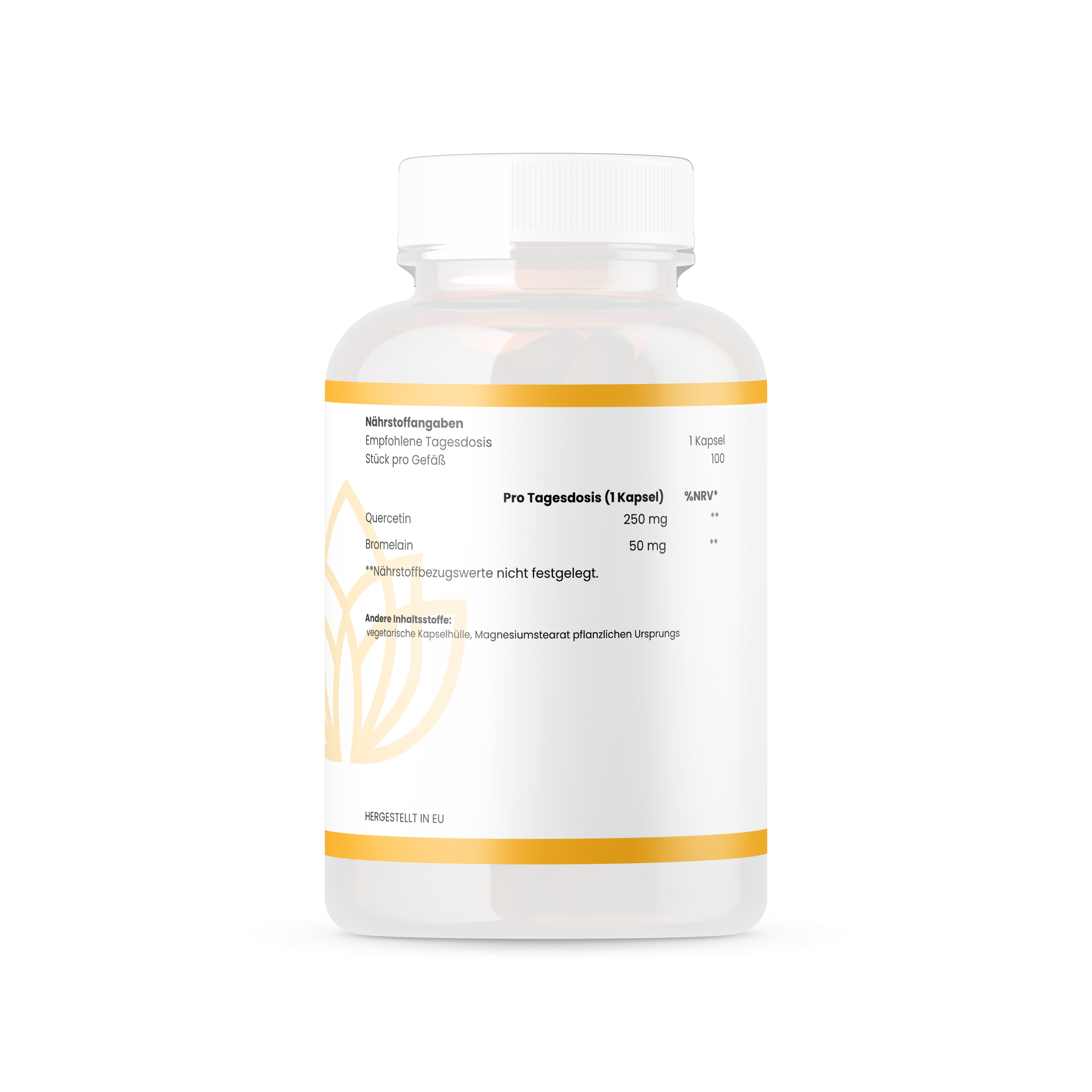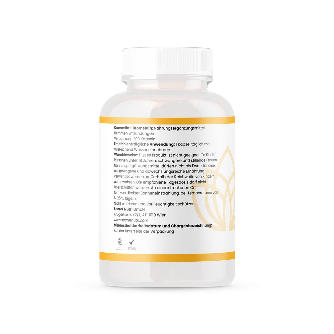 Nahrungsergänzungsmittel: Quercetin + Bromelain – unterstützt das natürliche Immunsystem, hat entzündungshemmende Eigenschaften und fördert eine gesunde Verdauung.